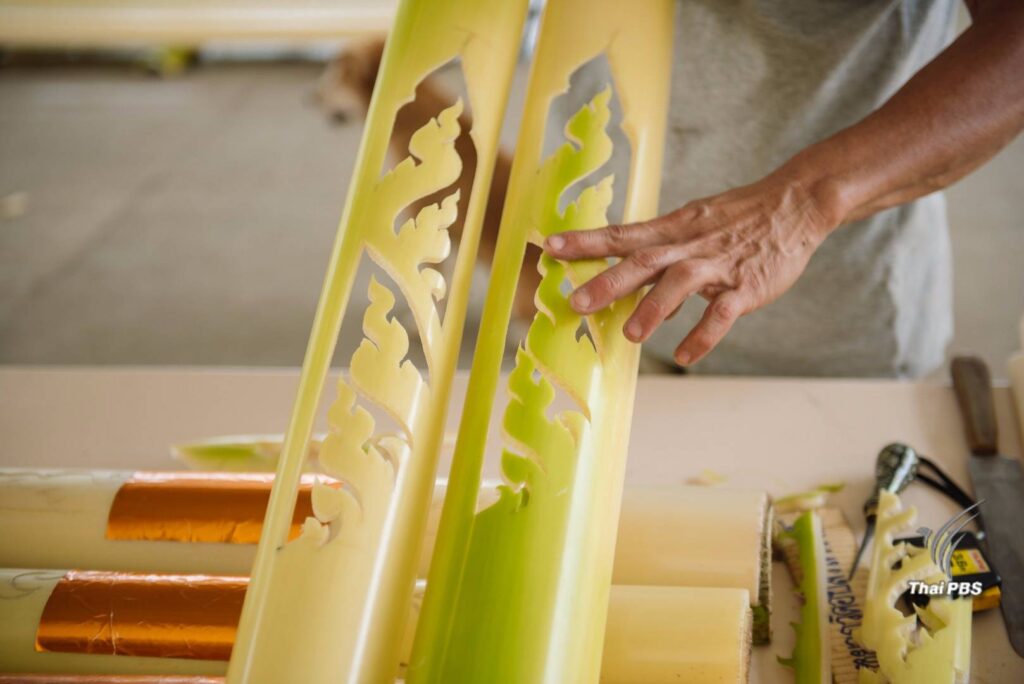 ลวดลายอันงดงามลงบนกาบกล้วยตานี ซึ่งแต่เดิมถูกใช้ในงานพระราชพิธีและงานมงคลสำคัญ